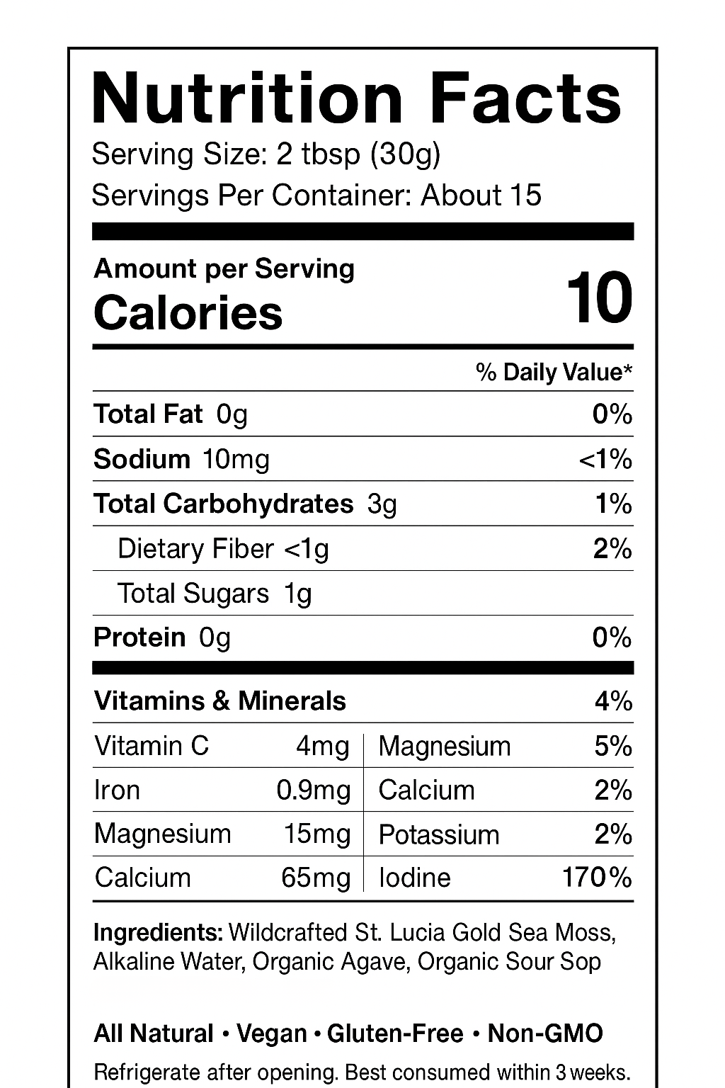 Ingredients: Wildcrafted St. Lucia Gold Sea Moss, Alkaline Water, Sour Sop, Organic Agave nectar.